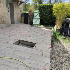 Création complète d’une terrasse de 100 m², incluant une extension en béton et l’installation d’une tonnelle.